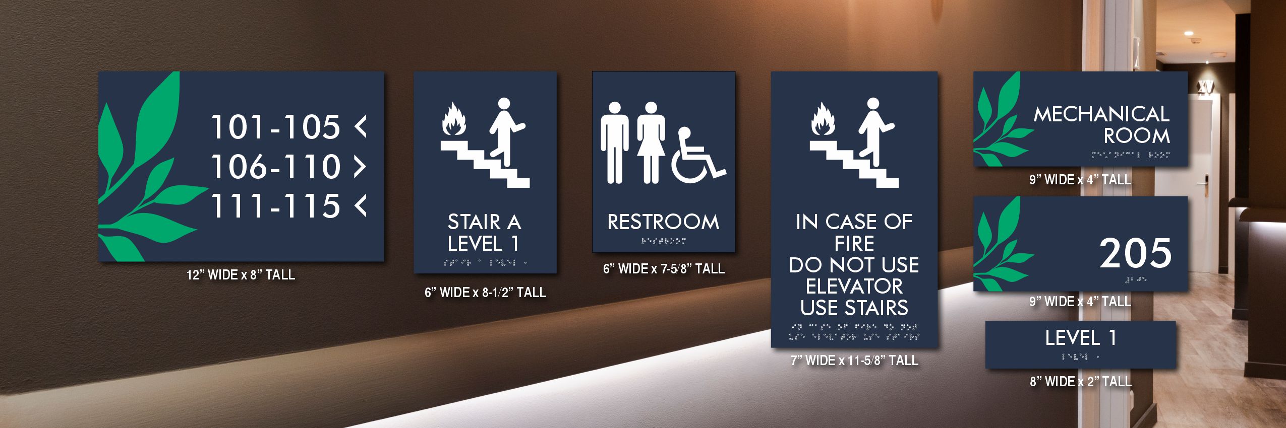 - Stair ID Signs: Safety-focused signs to identify stairwells and exits.